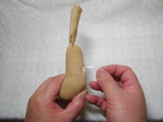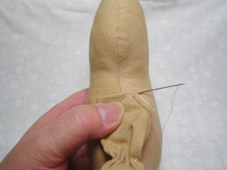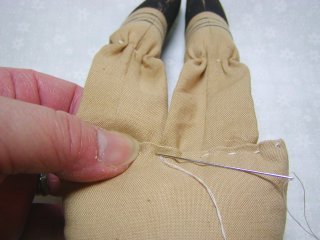 - 1cmくらいのところをぐし縫いしてボディにはかせ縫い絞ります。この時少しきつめに糸を絞るとパンツが脱げることはありません。