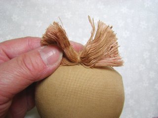 - 髪の毛は中心から縫い目にそってグルーガンでつけていきます。二つ目からは左右交互にバランスよくつけていきます。