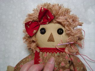 - 目をつけます。頭の後ろから針をまっすぐに突き刺して片方ずつ仕上げていきます。この時少しボタンがくぼむくらいに糸を引っ張り頭の後ろでくくります。鼻のフェルトを縫い付けて口をバックステッチしていきます。この時下絵を描いておくと失敗がありません。