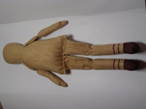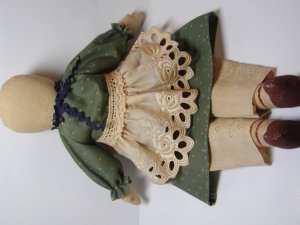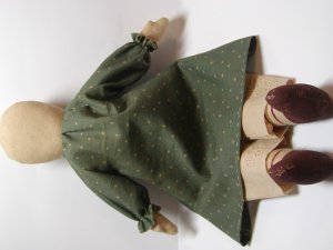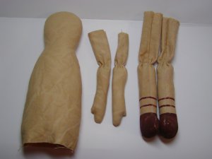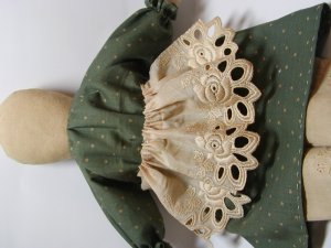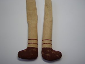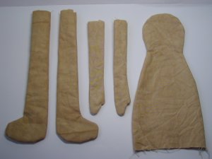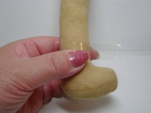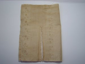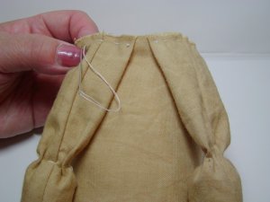 - パンツを7mmの縫い代をつけて縫います。股下部分に左写真のようにYの字に切り込みをいれておきます。表に返し1cmくらいのところをぐし縫いしてボディにはかせ縫い絞ります。この時少しきつめに糸を絞るとパンツが脱げることはありません。