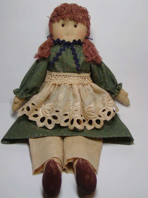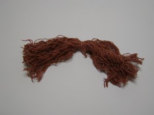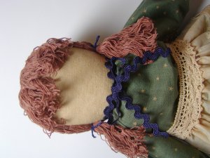 - 髪の毛は最初に前髪の中心をグルーガンでつけて次に横髪をつけていきます。この時束ねた中心をそろえるときれいです。おさげ髪になるように左右紐でくくります。首元にジャバラテープをまいてリボンくくりをし、目と口をつけ、ほほ紅をぬります。