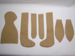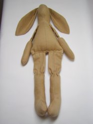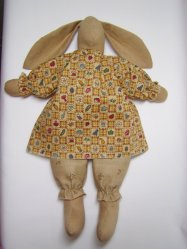 洋服を着せたところです。この後目と鼻を仕上げます。エプロンと衿のレース、リボンをグルーガンかボンドで付けます。