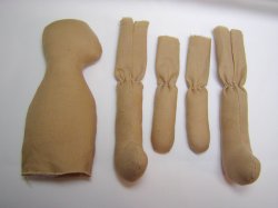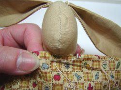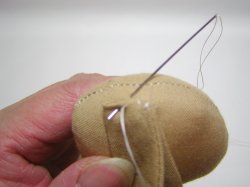 ボディに綿詰めをして片方の身頃に足を縫いつけます。この時は左の写真のようにボディの縫い代の部分2〜3mmのところをぐし縫いしてつけていきます。