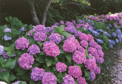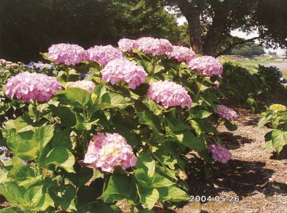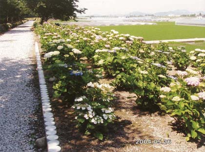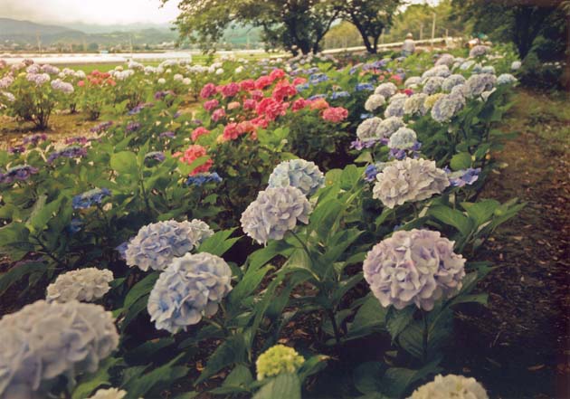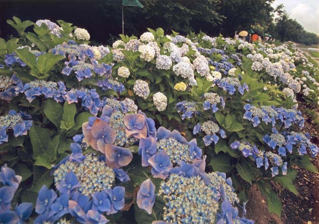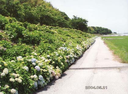 野市あじさい街道にはガクアジサイ、墨田の花火、城ヶ崎などの品種があり総数1万9千本が上井川沿いに植えられています。そもそもこの川沿いには空き缶等のゴミ投棄が絶えず、このままでは川のみならず地域全体がゴミ箱状態になってしまう...。これを危惧した地元の西佐古有志が立ち上がり野市町(現香南市)の協力を得、あじさいを植えたのが始まりでした。